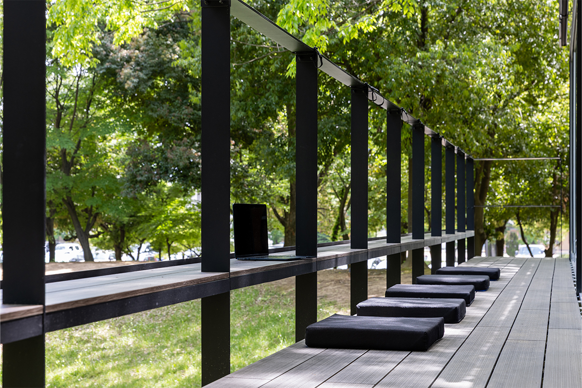 JR⻑野駅東⼝から徒歩10分の若⾥公園内に アウトドアリビング型の 新感覚Third Placeが誕⽣! ガラス張りの透明感と開放感ある空間で、 クリエイティブな時間を。
